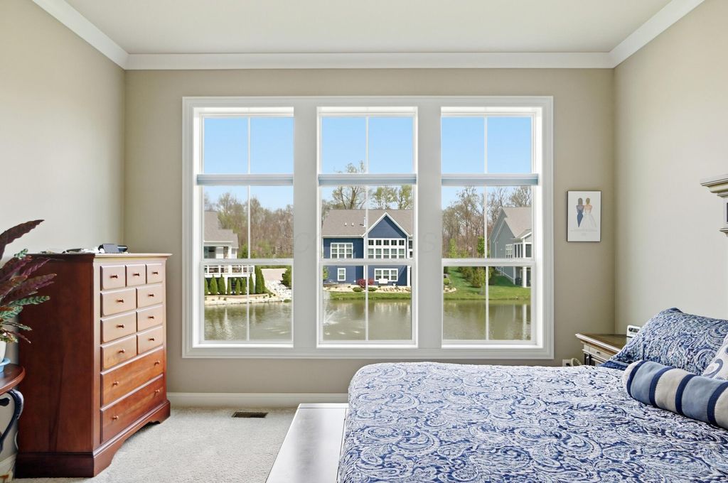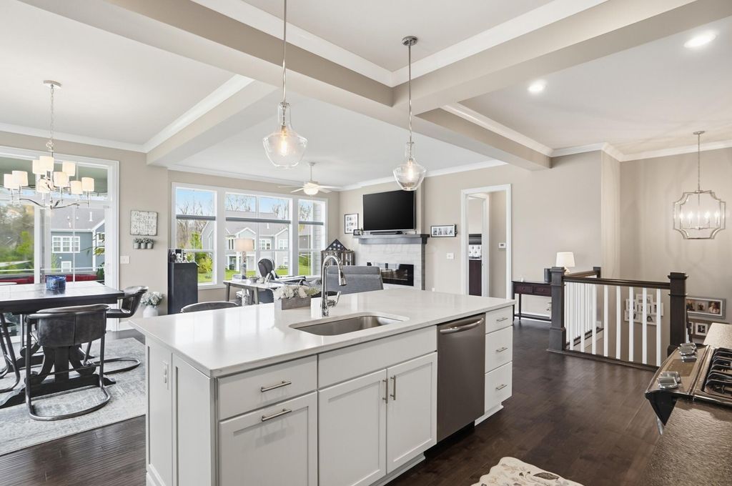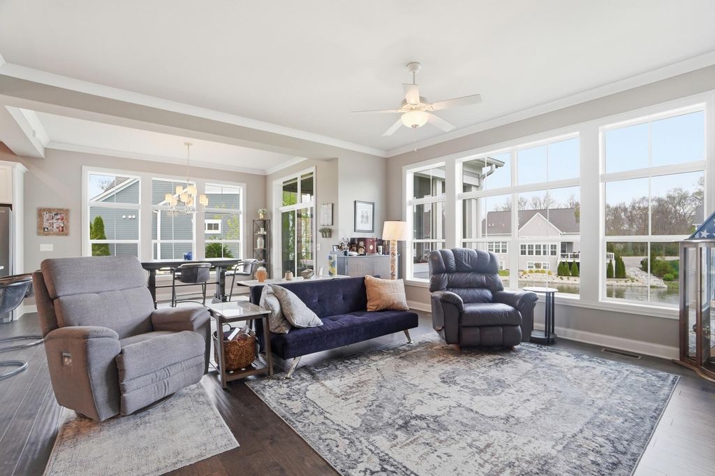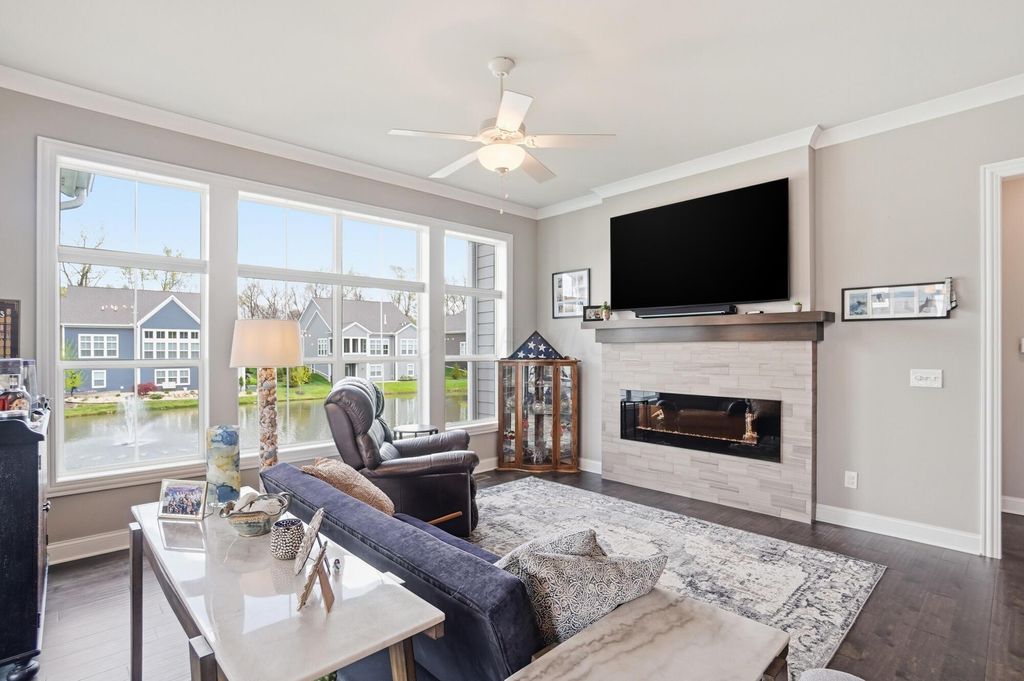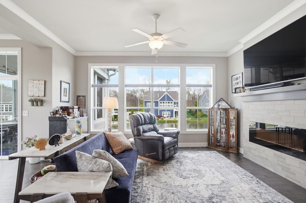 Discover refined living in this stunning Ranch home, built by Bob Webb, with 3,222 Sq Ft, on a walkout lot with serene pond views. The first floor owner's suite offers a private retreat with a spa inspired bath designed for relaxation. Inside, you'll find an open concept layout with soaring 10 foot ceilings, a dramatic wall of windows, rich hardwood flooring, custom trim details, and a beautiful decorative fireplace that anchors the main living space. The gourmet kitchen is both stylish and functional, featuring stainless steel appliances, an oversized island, granite countertops, and a dedicated prep kitchen to keep everything organized. With 4 spacious bedrooms, 3 full baths, this home offers luxurious finishes, easy living, and seamless indoor outdoor entertaining. Schedule your showing today!